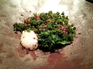- 煮物:熊肉ときのこの煮物。1mmの薄切りにした熊肉は繊細で、脂の多い先入観を覆す。